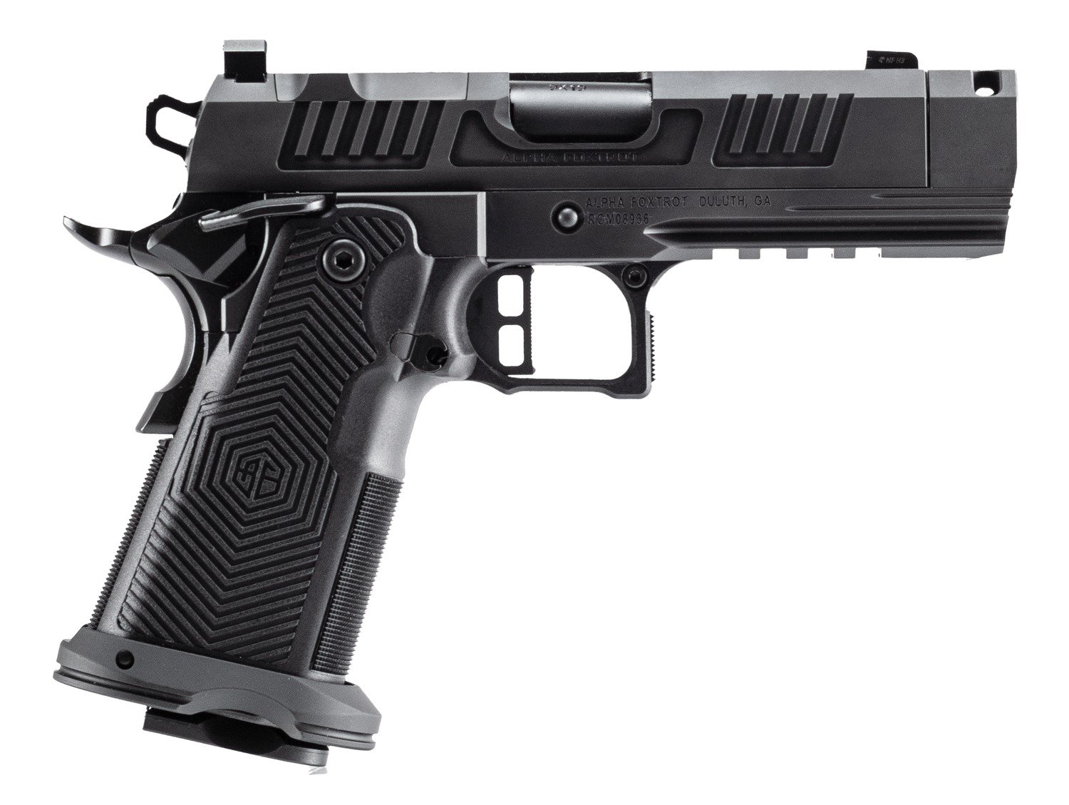 The AF1911 Romulus is hammer fired featuring a SUS416 black polished DLC finish on the frame and slide; Bull ramped, threaded, compensated barrel; injected polymer grip module; extended beavertail, Double Stack magazine; glowing night sights; extended slide release: flared magwell; Picatinny rail; RMSC optics cut; ambi thumb safety. Includes MOS adapter plate, RMSC and RMR plate, 17rd and 20rd magaine.