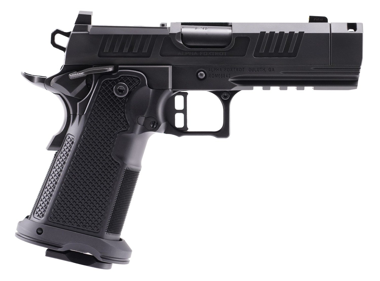 Alpha Foxtrot AA47X1QIG-XDBK19 AF1911 Romulus 9mm Luger 20+1 3.50″ Black DLC Stainless Steel Threaded Compensated Barrel, Optic Ready/Serrated Slide & Frame w/Beavertail & Picatinny Rail, Aluminum Gri