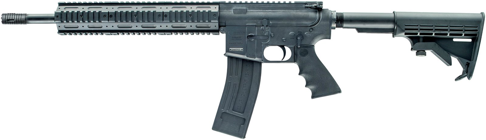 Action: Semi-Auto – Caliber: 22 LR – Capacity: 28 – Finish: Matte Black – Material: Polymer/Steel/Alloy – Stock: Adjustable Polymer 6 Position – Barrel Length: 16 – Overall Length: 34.3 – Weight: 5.7 lbs – Sights: Fixed Front – Safety: Manual – Finish: Matte Black – AR rifles are easy to handle and fun to shoot. The MFour captures the best features and attributes of the AR platform but chambered in 22 LR. A near identical replica of an M4 carbine the Chiappa MFour is perfect for inexpensive plinking practice or for training at ranges where centerfire rifle cartridges are not allowed. MFour rifles come with a removable carry handle flattop Picatinny rail A2 style front sight post and 16 barrel. Many MIL SPEC components fit the Chiappa MFour including grips two piece handguards trigger etc. The MFour comes with either two 10 round magazines or two 28 round magazines depending on local laws and regulations. The MFour is also available in a pistol configuration with a 6 barrel and as complete upper receivers that will work on any MIL-SPEC AR lower receiver.