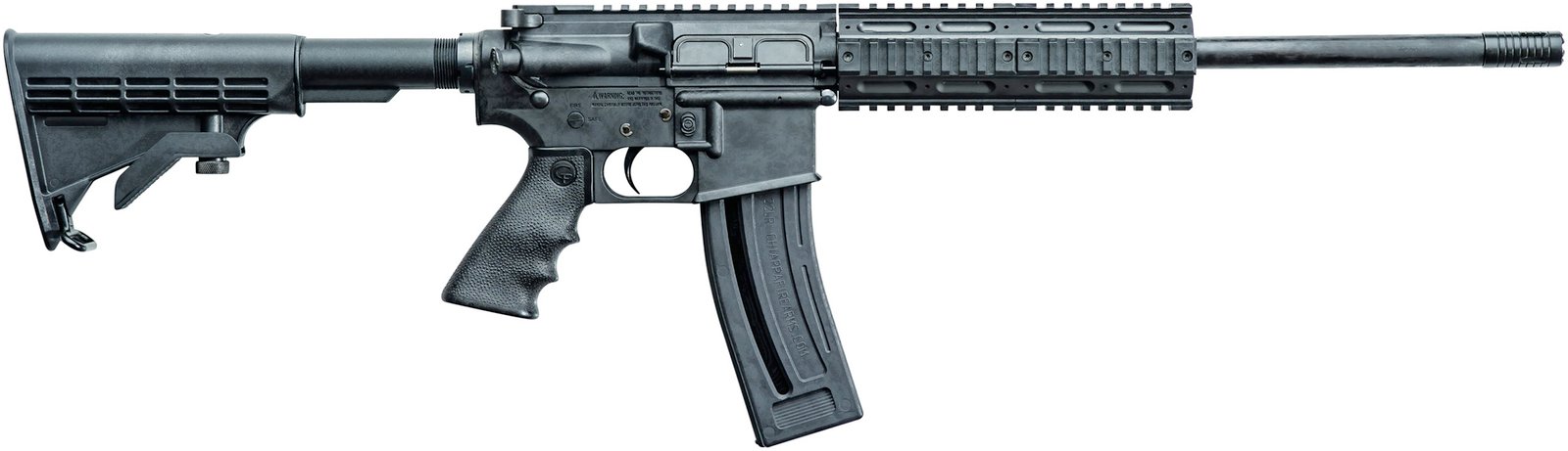 Action: Semi Auto – Caliber: 22 LR – Capacity: 28 – Finish: Matte Black – Material: Polymer/Steel – Stock: Adjustable Polymer 6 Position – Barrel Length: 16 – Overall Length: 34.3 – Weight: 5.7 lbs – Sights: Fixed Front – AR rifles are easy to handle and fun to shoot. The MFour captures the best features and attributes of the AR platform but chambered in .22lr. A near identical replica of an M4 carbine the Chiappa MFour is perfect for inexpensive plinking practice or for training at ranges where centerfire rifle cartridges are not allowed. MFour rifles come with a removable carry handle flattop Picatinny rail A2 style front sight post and 16 barrel. Many MIL SPEC components fit the Chiappa MFour including grips two piece handguards trigger etc. The MFour comes with either two 10 round magazines or two 28 round magazines depending on local laws and regulations. The MFour is also available in a pistol configuration with a 6 barrel and as complete upper receivers that will work on any MIL-SPEC AR lower receiver.