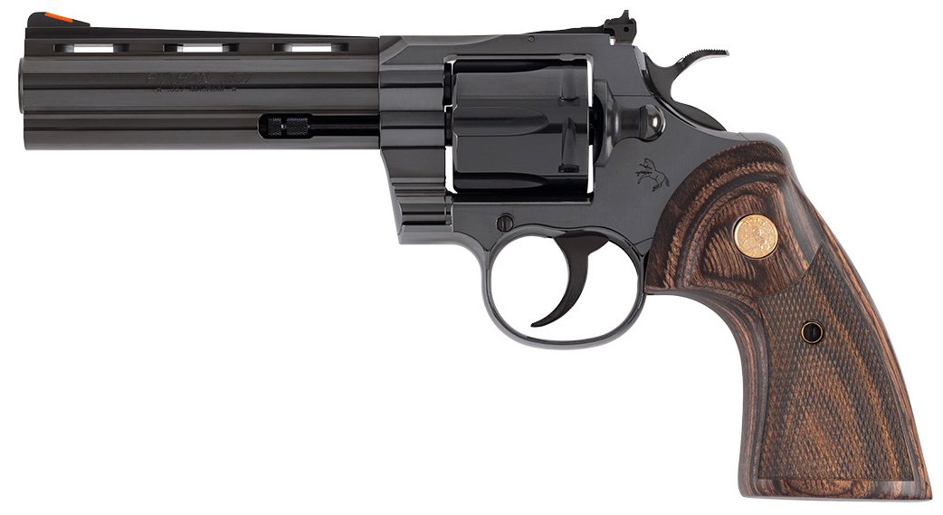 Shooter’s Model are 100% New in the Box products that may have a slight finish imperfection that is not covered by Colt’s one year warranty. The slight imperfection would occur during the manufacturing process and are typically very hard to see except to the well-trained eye or with a magnifier. – FEATURES – Walnut Target Grips with a gold Colt medallion. – Forged carbon steel frame with a polished blued finish and matte surface on the top rib. – One-piece full lug vented rib carbon steel barrel with recessed target crown. – The Python® features a redesigned rear sight with 30% more steel beneath the adjustable rear target sight giving you a stronger revolver and more robust shooting experience. – User-interchangeable front sight. – Fluted 6-round cylinder chambered for 357 Magnum and also accommodates 38 Special cartridges. – Unloaded Weight 43 oz (1219 g) – Capacity 6 Rounds – Frame Material Carbon Steel – Finish Polished Blued – Barrel Technical 1:14 LH 6 Groove – Barrel Length 5 (127 mm) – Overall Length 10.5 (267 mm) – Overall Height 5.5 (140 mm) – Overall Width 1.55 (39 mm) – Front Sight Red Ramp (Interchangeable) – Rear Sight Target Adjustable Sight for Windage and Elevation – Trigger Action Double and Single Action – Trigger Pull Double Action 7-9.5 lbs (31-42 N) – Grip Walnut Target Grips Gold Medallion