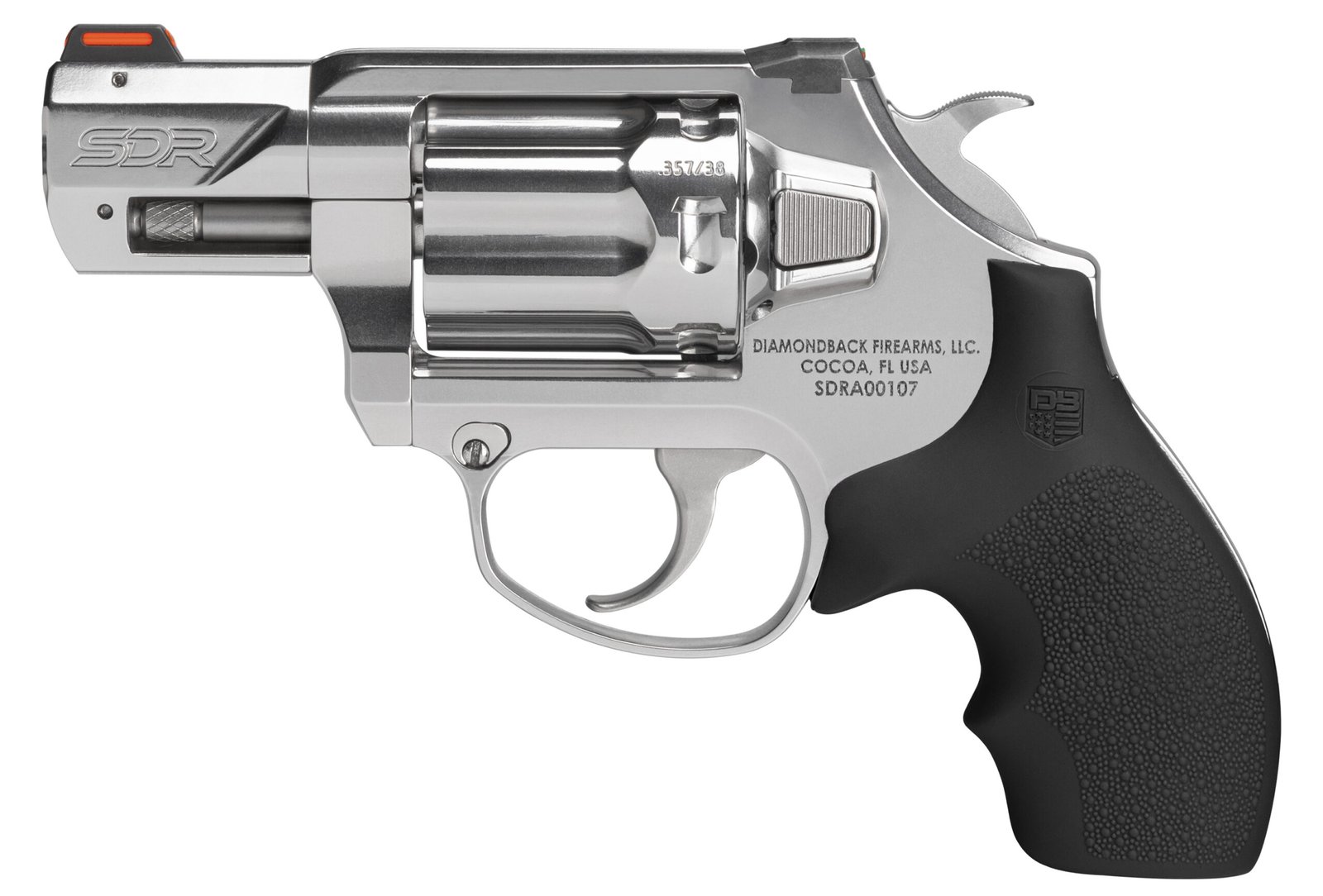 Designed for those who prioritize reliability and quality the SDR delivers peace of mind to home an personal defense situations. The SDR’s compact frame two-inch barrel and six shot cylinder are machined from premium stainless steel for strength and durability. – Low profile fiber-optic sights and a sleek frame with concealed hardware and rounded edges prevent snags and hang-ups when the revolver is drawn. Weighing in at just 21 ounces this compact package is perfect for concealed carry. – An exceptionally smooth match grade trigger and high-vis sights promote accuracy and create confidence in every shot while an ergonomically placed push button cylinder release and chamfered cylinder chambers ensure seamless loading and round ejection. – Specifications – Caliber: .357Magnum /.38 Special +P – Length: 6.53 in – Width: 1.38 in – Height: 4.44 in – Weight: 21.20 oz – Frame Material: Forged Stainless Steel – Frame Finish: Polished – Barrel Length: 2.00 in – Barrel Material: Stainless Steel – Barrel Finish: Polished – Twist: 1 : 18.75 RH – Grooves: 6 – Capacity: 6 Rounds – Action: DA/SA – Trigger Pull: 9-11.5 lbs Non-Stacking – Sights – Front Sight: Fixed Fiber Optic Orange – Rear Sight: Low Profile Dovetail Fiber Optic Green – Grip Black Rubber w/ Diamondback Logo