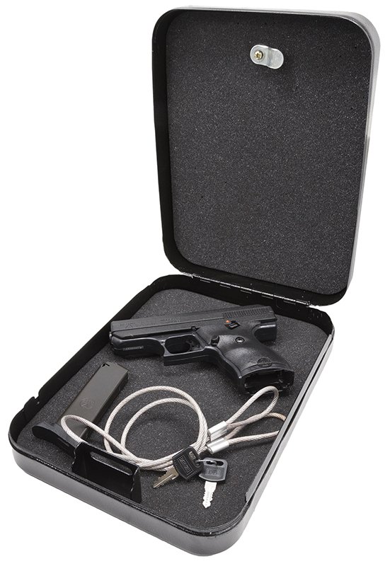 Hi-Point American-made handgun has a high-impact polymer frame with high-impact grips with a durable, attractive easy-grip finish which assures a firm, comfortable grip and exceptional recoil control. It features a quick on/off thumb safety, magazine disconnect safety and last round lock open feature; adjustable 3-dot sights; +P rated and accept all factory ammunition.Includes rear peep sight and trigger lock. The Home Security Package combines the 9mm pistol with a strong and secure lock box. Constructed of heavy-duty overlap pry-resistant, 18-gauge powder coated steel, the lock box is fitted with a half-inch memory foam liner. It includes a cable and matched number keys.