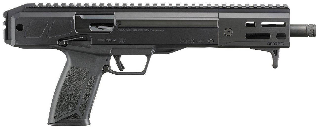 Caliber: 5.7x28mm – Capacity 20 – Handguard M-LOK® Attachment Slots – Sights None – Receiver Material Aluminum Alloy – Receiver Finish Type III Hard-Coat Anodized – Barrel Feature Threaded – Thread Pattern 1/2-28 – Barrel Length 10.30 – Overall Length 16 – Barrel Material Aluminum Alloy – Barrel Finish Nitride – Weight 66.5 oz. – Grooves 8 – Twist 1:9 RH – Large format pistol utilizes the same steel magazines and familiar ergonomic controls as the Ruger-5.7 pistol. – Features a 10.3 nitride treated steel barrel for strength accuracy and longevity. – 1/2-28 TPI threaded barrel with thread protector allows for the attachment of popular muzzle accessories. – Impressive ergonomics with ambidextrous manual safety reversible charging handle ergonomic bolt release and extended magazine release latch. – Utilizes Ruger’s safe reliable and proven Secure Action fire-control system that combines a protected internal hammer with a bladed-safety trigger. The trigger has a short smooth pull clean break and positive reset. – CNC-milled handguard that is Type III hard-coat anodized aluminum for maximum durability with M-LOK® accessory attachment slots. Multiple QD sling sockets for maximum versatility. – Full-length Picatinny rail for optic mounting. – Safety features include: 1911-style ambidextrous manual safety; an integrated trigger safety; neutrally balanced sear with significant engagement and strong spring tension; and hammer catch to help prevent the hammer from contacting the firing pin unless the trigger is pulled. – Also includes: one Ruger-5.7 steel pistol magazine ambidextrous magazine button M-LOK QD sling socket hand stop and hex wrench for disassembly.