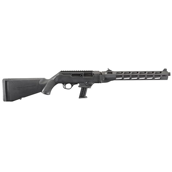 Caliber: 9mm Luger – Stock: Black Synthetic with Aluminum Free-Float Handguard – Capacity: 17 – Barrel Length: 16.12 – Overall Length: 34.37 – Barrel Feature: Threaded Fluted – Front Sight: Protected Blade – Rear Sight: Adjustable Ghost Ring – Thread Pattern: 1/2-28 – Weight: 7 lb. – Length of Pull: 12.62 – 14.12 – Material: Aluminum Alloy – Finish: Type III Hardcoat Anodized – Twist: 1:10 RH – Grooves: 6 – CNC-milled handguard that is Type III hard-coat anodized aluminum for maximum durability with Magpul® M-LOK® accessory attachment slots on all four sides for easy mounting of M-LOK-compatible rails and accessories. – Interchangeable magazine wells for use of common Ruger® and Glock® magazines. Ships with SR-Series/Security-9® pistol magazine well installed and an additional magazine well accepting Glock® magazines is included*. Ruger American® Pistol magazine wells are available at ShopRuger.com. – Easy takedown enables quick separation of the barrel/forend assembly from the action for ease of transportation and storage. Takedown is as simple as locking the bolt back and verifying that the rifle is unloaded pushing a recessed lever twisting the subassemblies and pulling them apart. – Dead blow action features a custom tungsten dead blow weight that shortens bolt travel and reduces felt recoil and muzzle rise. Bolt is machined from heat treated chrome-moly steel to ensure strength structural integrity and durability. – Reversible magazine release and reversible charging handle to support ambidextrous use or one-handed control manipulation while maintaining a proper firing grip*. – Cold hammer-forged chrome-moly steel barrel with ultra-precise rifling provides exceptional accuracy and longevity. The heavy contour barrel provides consistent accuracy while barrel fluting sheds unnecessary weight and allows for quick handling. – Threaded barrel with included thread protector allows for use of standard muzzle accessories. – Accurate sighting system with adjustable ghost ring rear aperture sight and non-glare protected blade front sight. – Soft rubber buttpad with spacers allows the rifle to be properly sized for different shooters or varying levels of outerwear or defensive gear (three 1/2 spacers included). – Durable glass-filled nylon synthetic buttstock features a proprietary texture for enhanced control and an integral sling mount for rapid sling attachment . – Light crisp trigger pull with minimal overtravel and positive reset utilizing proven 10/22® trigger components. – CNC-machined from an aerospace-grade 7075-T6 aluminum billet the receiver includes an integrated Picatinny rail and is Type III hard-coat anodized for maximum durability. – Also includes: one SR-Series pistol magazine and hex wrenches for rear sight adjustment buttpad spacer adjustment and charging handle removal.