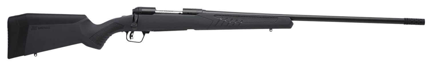 Savage’s 110 Long Range Hunter model is designed for extreme-range precision. It features Savage’s AccuFit synthetic stock with five comb riser sizes for the perfect cheek-to-stock weld, four composite inserts to establish your unique length-of-pull, and AccuStock. The AccuStock consists of a rigid rail system firmly embedded in the stock throughout the foreend of the rifle. It also engages the action three dimensionally along its entire length. The 110 Long Range Hunter also features AccuTrigger for flexibility, a threaded carbon steel barrel, soft grip fore-end and pistol grip, and a hinged floorplate magazine. This 6.5 Creedmoor model has a 26″ matte black button-rifled barrel with and adjustable muzzle. It also has a gray finish stock.