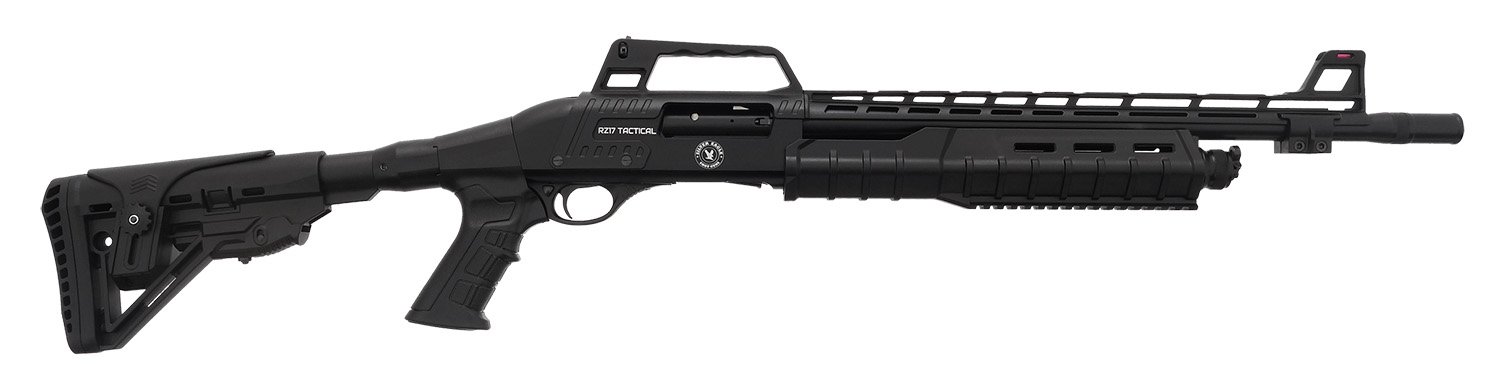 This tactical version of our popular RZ17 pump action features the same forward-assist action, ensuring a positive lockup and elimination of short-stroking. Stock is adjustable for length and comb height. Rear sight in carry handle is fully adjustable. Carry handle is easily removed, permitting installation of optics. Ample rail space has all the room you need for extras. Barrel: 18.5 inch with removable Cylinder choke and removable fiber optic front sight.