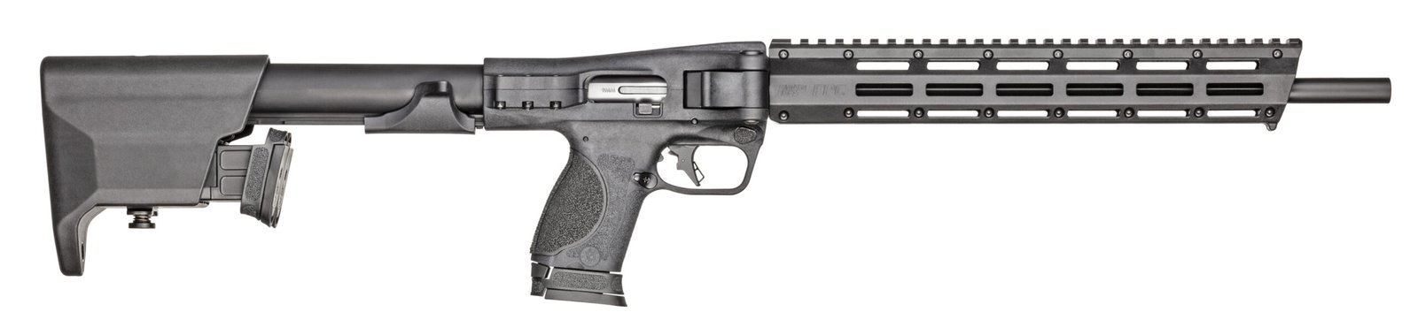 The New M&P® FPC – Showcases our brand new compact folding design. Coming with three 10-round magazines the in-stock magazine storage with a quick-release latch makes reloading convenient and quick. The M&P® FPC accepts any M&P® full-size or compact 9mm magazine. The M&P® FPC also comes with a carrying bag with additional storage and firearm securing straps. – Model M&P® FPC Compliant Model – Front Sight N/A Optics-ready – Rear Sight N/A Optics-ready – Handguard M-LOK® slots on handguard with Picatinny- style rail on top – Stock Polymer Fixed 14.5 LOP – Weight Carbine Only -5.03 lbs. (2280 g) w/three mags -5.58 lbs. (2531 g) – Lengths Unfolded 30 3/8 (77.2 cm) Folded 16 3/8 (40.6 cm) – Barrel 4140 Steel Black Oxide Finish – Action Blowback semi-auto – Barrel Length 16.25 (41.3 cm) Non-threaded muzzle – Bolt Stainless Steel – Rifling 1:10 – Grip Total of four interchangeable palmswell grip inserts. – Frame/Receiver Aluminum (tube) Hard Coat Black Anodized Finish – Compact Folding Design – With a slim and compact design this Pistol Cailber Carbine (PCC) can be stowed in small places making it very accessible. The ability to fold from the side makes sure that mounted optics aren’t disturbed and its easy to deploy when needed. – Compatibility – Magazine compatibility with the M&P® M2.0 platform gives this PCC a robust ecosystem available in the market today and rewards existing M&P® owners. – Value – Comes with three 10-round magazines out of the box giving the consumer 30 rounds of 9mm onboard. Each carbine also comes with a low-profile carry bag to discreetly keep the PCC at the ready. – FOLDS TO COMPACT SIZE FOR EASY CARRY – IN-STOCK MAGAZINE STORAGE – ACCEPTS ANY M&P® FULL-SIZE OR COMPACT 9MM MAGAZINE