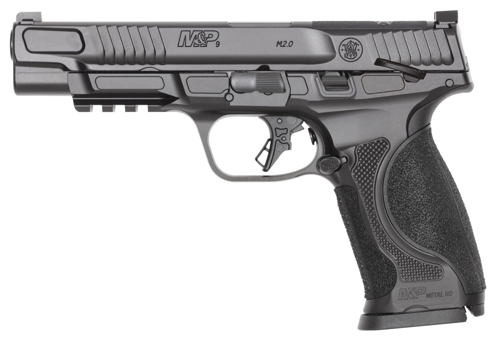 The next evolution in the M&P line of handguns the Metal HD represents the ultimate heavy-duty pistol. Excelling in competition or any situation that requires repeatable accurate shots on target the Metal HD dominates the field. Combining a stainless steel frame with new texturing a 5 stainless steel barrel and more positive slide serrations this pistol melts into your hand and balances like an extension of your arm while also providing positive purchase on the slide for easy racking. The Metal HD is the perfect package yielding nothing but the best shooting experience of any M&P yet. – 5 Barrel and All-Stainless Frame- Heavy stainless build and 5 barrel reduce recoil for faster more accurate follow-up shots. – Enhanced Frame Texture- Aggressive texture ensures secure non-slip grip even in wet or sweaty conditions. – Night Fision Tritium Front Sight- Bright tritium glow delivers fast reliable sight acquisition in any lighting. – 5 1:10 twist stainless steel w/Armornite® finish. – Stainless steel slide w/Armornite® finish. – Blacked-out serrated U-notch rear sight. – Night Fision® Yellow/Green tritium front sight. – Full-size forged stainless steel frame w/Armornite® finish. – Flat-face trigger. – Manual Thumb Safety. – Frame is equipped with a front rail. – Total of four interchangeable palmswell grip inserts. – Ships with (two) 10-round magazines. – width 1.3 in – length 8.25 in – height 5.5 in – weight 34.9 oz – CALIBER 9MM – SIZE FULL – CAPACITY 10 – ACTION STRIKER FIRED – BARREL LENGTH 5 – GRIP POLYMER – SIGHTS NIGHT SIGHTS – OPTIC READY YES – SAFETY THUMB SAFETY – COLOR/FINISH BLACK – STATE COMPLIANCE CO CT DE HI IL MD NJ NY RI VT WA DC – THREADED BARREL NO – BARREL MATERIAL STAINLESS STEEL – FRAME STAINLESS STEEL – LASER NO – NUMBER OF MAGAZINES 2 – 10LB TRIGGER NO – MODEL M&P 2.0 METAL HD